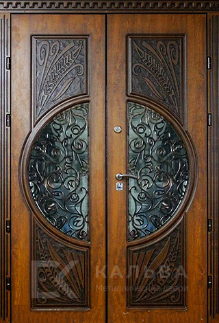 Фото «Входная двустворчатая дверь орех с круговым остеклением и ковкой №101»